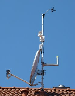 Als Wetterwebcam wird eine Mobotix M25 verwendet. Diese befindet sich in ca. 8 Meter Höhe, befestigt an der nördlichen Hausmauer. Aufgenommen wird, vom Betrachter aus gesehen, das Wolkenbild in westlicher Richtung über München. Im Bild der Kamera werden die aktuellen Wetterdaten eingeblendet und auf der Wetterwebseite alles 15 Sekunden aktualisiert. Für die Langzeitauswertung wird alle 10 Minuten ein Webcambild auf dem Server abgespeichert.